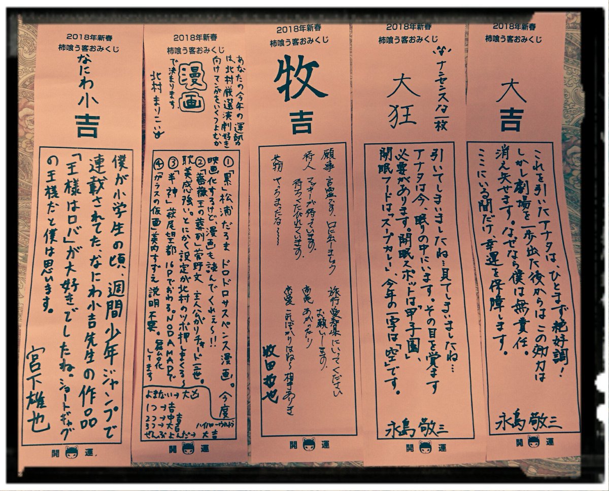 柿喰う客2018年本公演「俺を縛れ!」本多劇場。本日の成果品。極楽席特典のTシャツとポストカード(永田紗茅さん)、缶バッジ。フォトブックに缶バッジ全種類。おみくじ5枚。永島さん2枚と大当たりでした。 https://t.co/tev9904MbK
