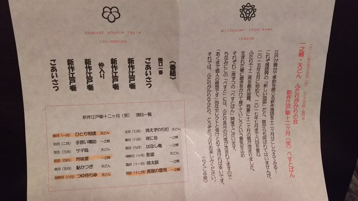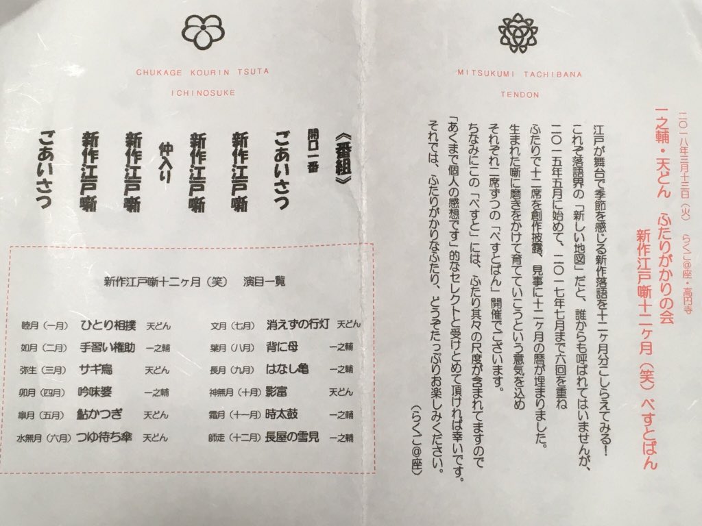 本日のネタ。どっぷり新作の一之輔・天どん ふたりがかりの会 新作江戸噺十二ヶ月(笑)べすとばん。振り幅大きい2日間笑。どちらも楽しく満喫!(^_^) https://t.co/ufYTtNrWtF