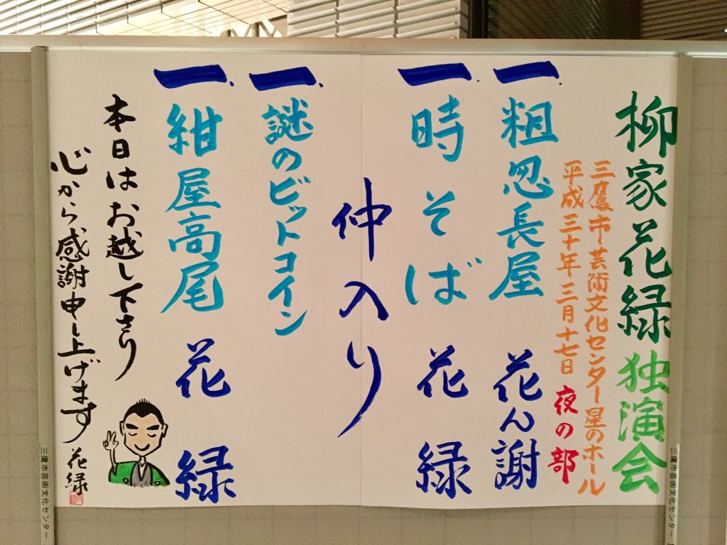 (昼の部の演目に続きまして)本日の『柳家花緑独演会』夜の部の演目をお伝えします。『粗忽長屋』柳家花ん謝 『時そば』柳家花緑 ~仲入り~『謎のビットコイン』柳家花緑 『紺屋高尾』柳家花緑 でした。ご来場いただきまして、まことにありが… https://t.co/gwV7SqkiDR