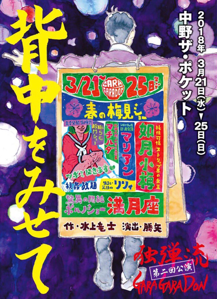 取材を進める大介が、満月座に触れるうち、そこに生きる個性豊かな満月座の人々の実態と、人間模様が複雑に絡まっていく物語。水上竜士さんの戯曲をお借りし、俳優、勝矢が、人間の表と裏を、クレイジーかつ大胆なストリップショーを交え演出する、独弾流GARAGARADON第二回公演!