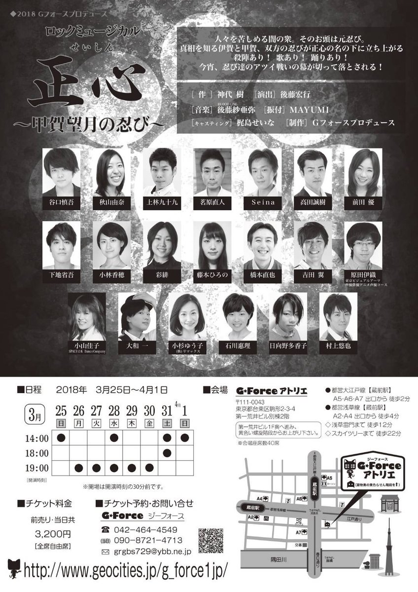 取り急ぎ☆ Gフォースプロデュース ロックミュージカル 「正心 ~甲賀望月の忍び~」 3月25日(日)~4月1日(日) 全10回公演 @ Gフォースアトリエ 全て終演致しました! ご観劇頂いたお客様 応援して頂いた方々 本… https://t.co/6NxyIBY5hK
