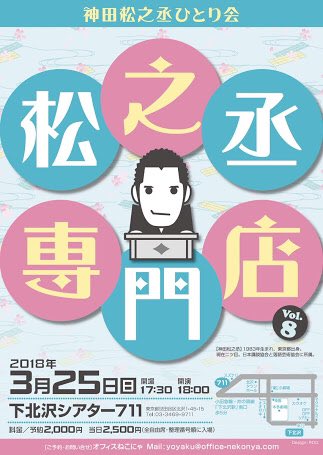 平成30年3月25日【日】松之丞専門店vol.8〜神田松之丞ひとり会〜 開演18時 シアター711 下北沢 に来ました 番の組 神田松之丞さん オフィスねこにゃproduce https://t.co/6DQCDEhVFB #講談