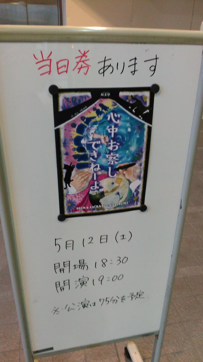【本日(5/12)の公演情報】96文字『心中お察しできねーよ。』本日19:00からの公演です。受付開始は開演の1時間前、会場は30分前です。当日券ございます。皆様のご来場をお待ちしております! https://t.co/87jmRGHaId