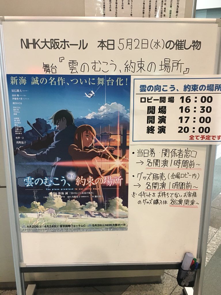 舞台【雲のむこう、約束の場所】 いよいよ、大阪公演。 そして大千穐楽日! NHK大阪ホールにて。 12時〜、17時〜開演の 2回公演です。 おわるのがとてもさみしい… 素敵すぎるカンパニーです。 いざ!! https://t.co/ovcYH2erhE #舞台雲約