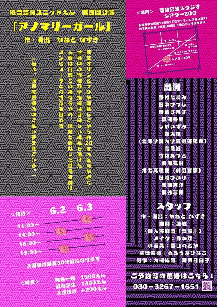 総合芸術ユニット えん『アノマリーガール』作・演出:金戸 一基 6月2日(土)14:00,19:00 6月3日(日)11:00,16:00 扇谷記念スタジオ・シアターZOO 前売:一般1500円、学生1300円 「私は、仮想桃源郷… https://t.co/z5xeuDcwKE