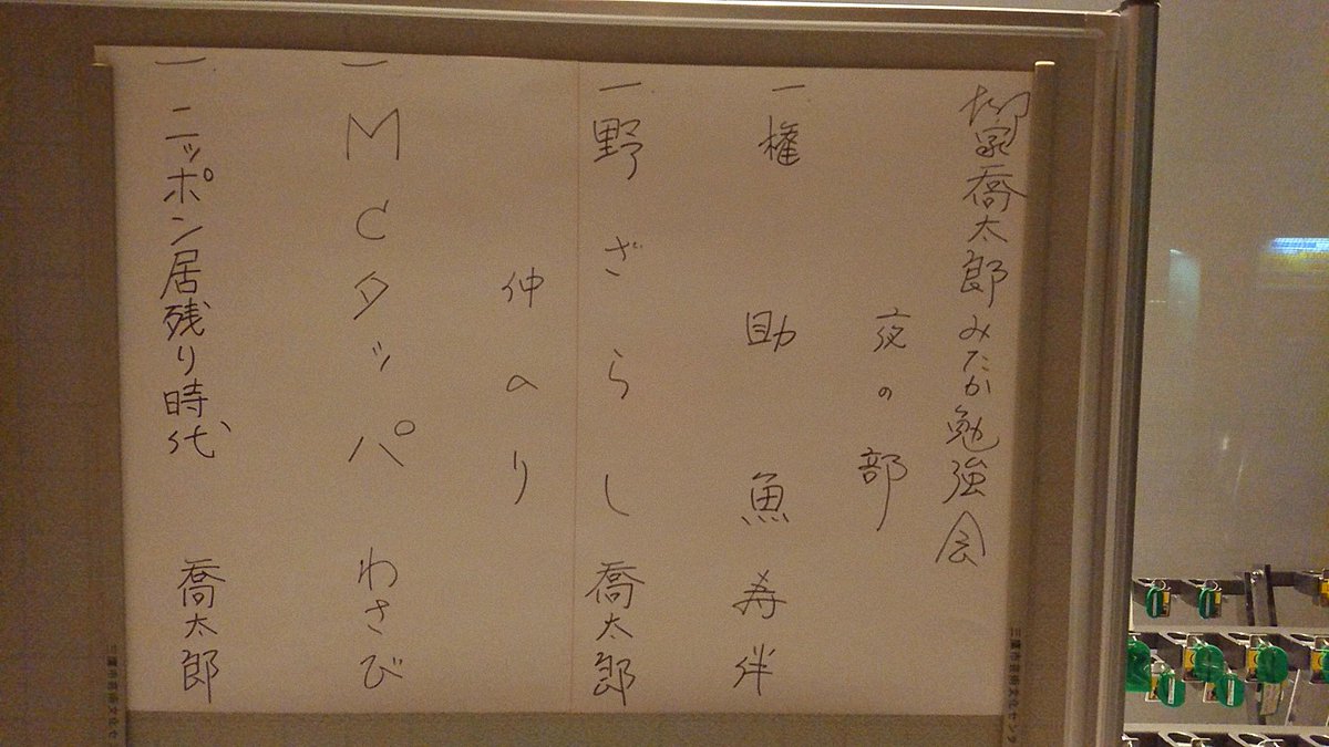 続きまして『柳家喬太郎みたか勉強会』<夜の部>の演目をお伝えします。 『権助魚』柳家寿伴 『野ざらし』柳家喬太郎 ~仲入り~ 『MCタッパ』柳家わさび 『ニッポン居残り時代』柳家喬太郎 でした。 ご来場いただきまして、まことにありがとうございました。