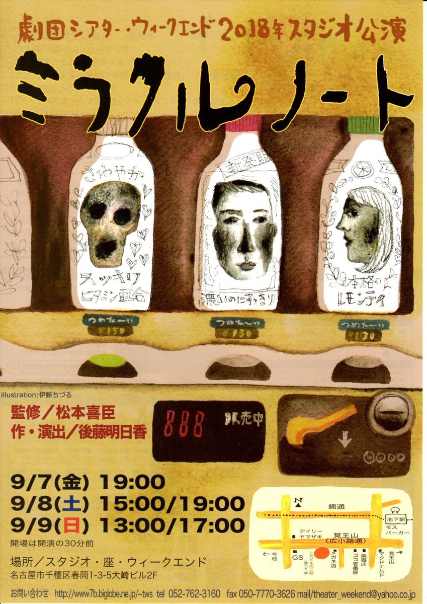 昨日無事に初日を迎えました。 ご来場頂いたお客様本当にありがとうございました。 今日、明日も席あります! 「ミラクルノート」 9/8(土)15:00/19:00 9/9(日)13:00/17:00 場所・スタジオ・座・ウィークエンド 料金2000円