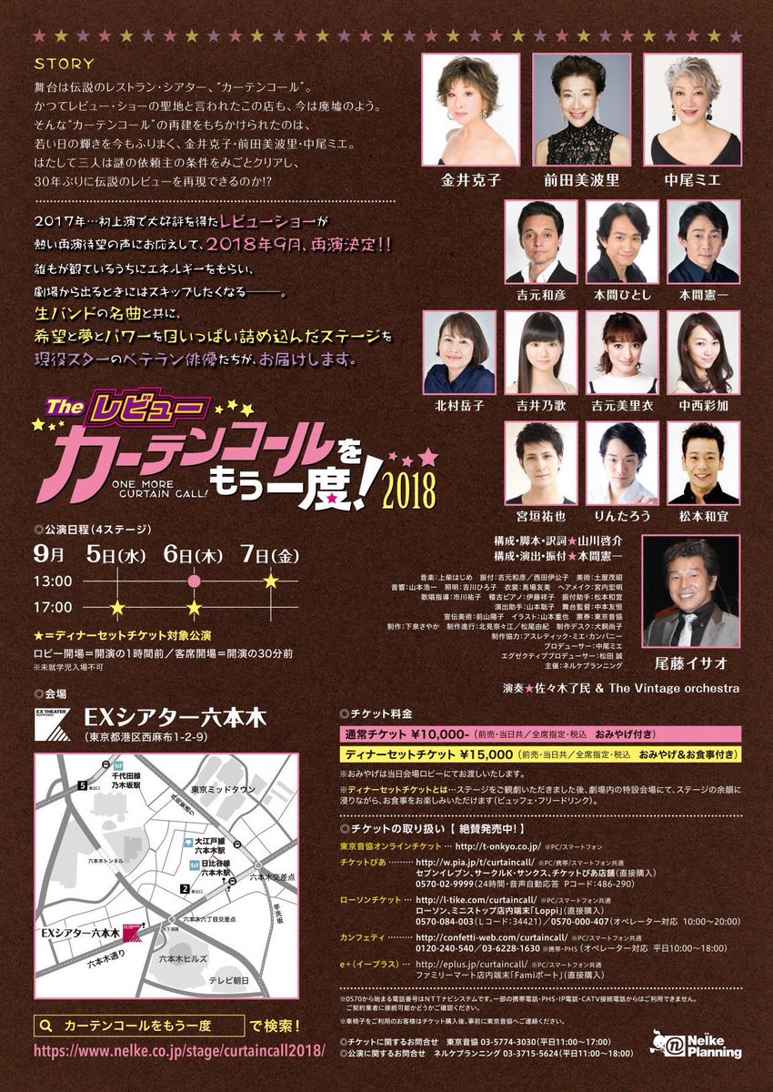 本間ひとし The レビュー「カーテンコールをもう一度!」2018 公演日:9月5日(水)~9月7日(金)会場:EXシアター六本木 出演者:金井克子、前田美波里、中尾ミエ、尾藤イサオ、他 お問い合わせ:チケット・東京音協03-57… https://t.co/Wm8XFNYzdg