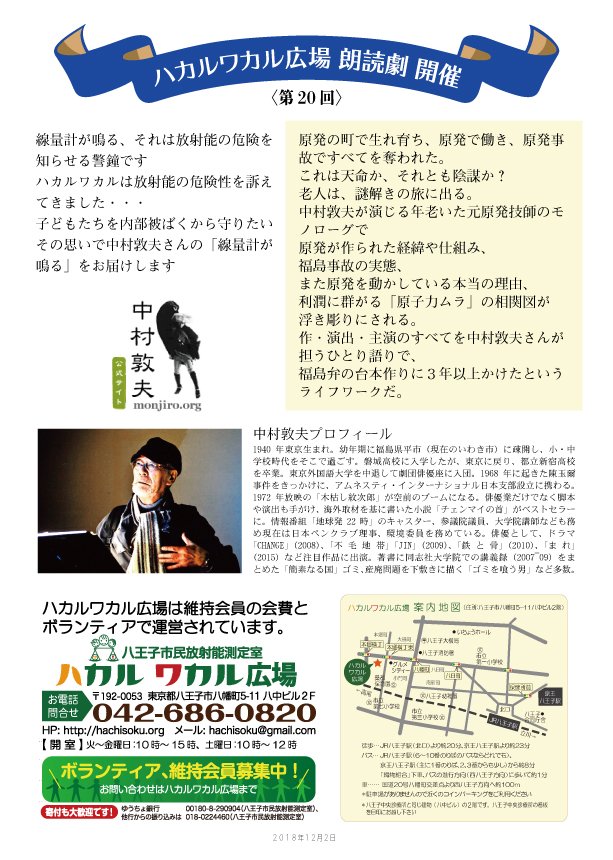 いよいよ明日開催!お電話でチケットのお取り置きを承ります(前売料金は本日まで)。 著書販売コーナーもあります。ぜひご来場ください。 【明日開催】『 朗読劇「線量計が鳴る~元・原発技術者のモノローグ」』10月20日(土)1… https://t.co/JA8FjucFQb #中村敦夫