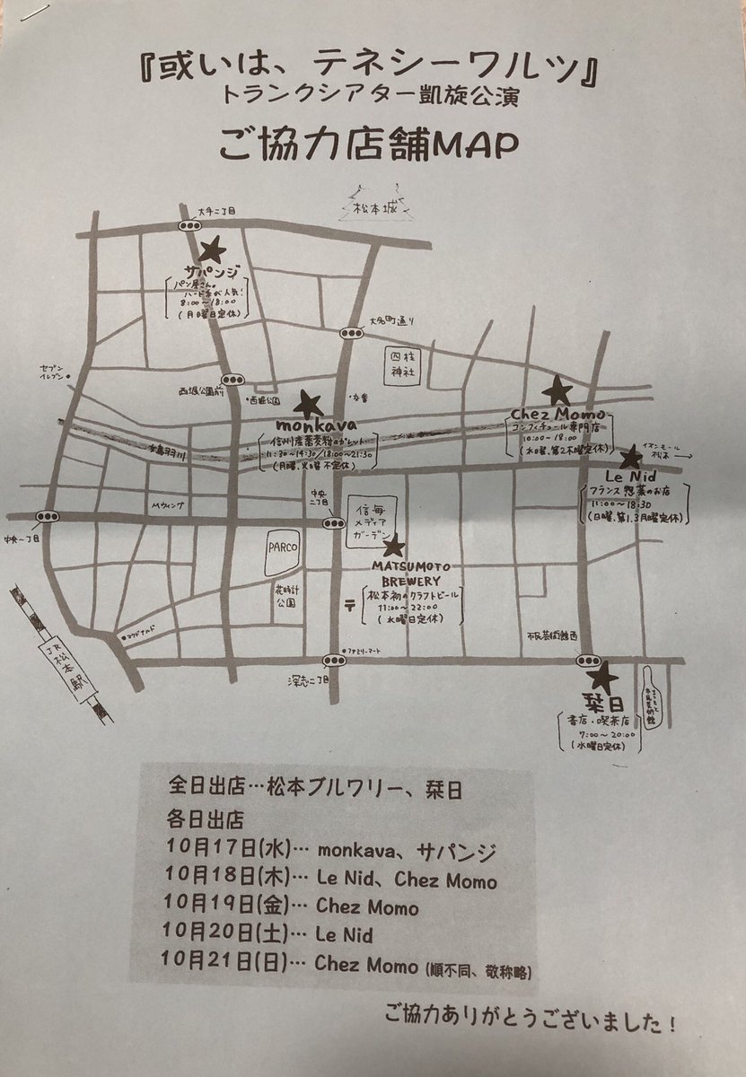 前略、松本の地より。 10/17 水曜日 「或いは、テネシーワルツ」幕上がる。 #前略松本の地より #松本市中央 #或いはテネシーワルツ #米田屋 @yonetaya https://t.co/KWDi2KOw7i #前略松本の地より #松本市中央 #或いはテネシーワルツ #米田屋