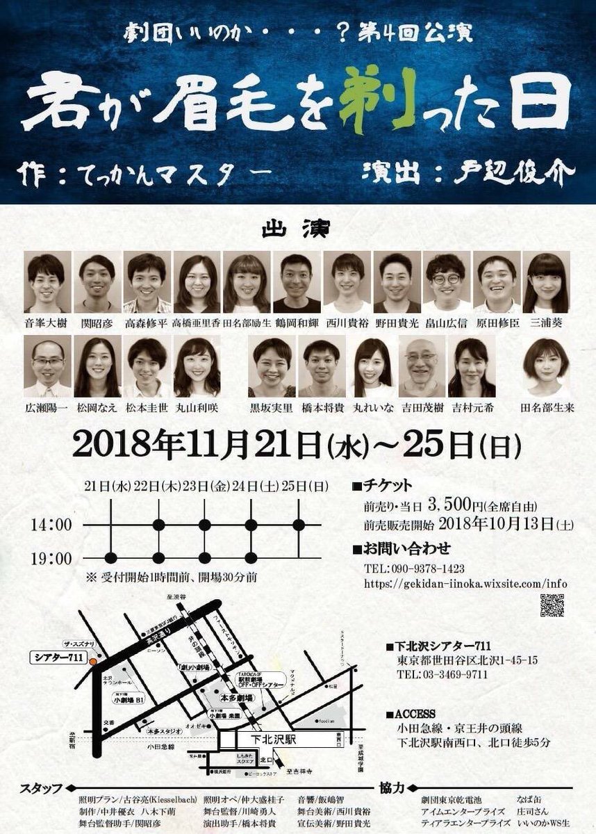 劇団いいのか・・・?第4回公演、「君が眉毛を剃った日」終演いたしました! 御来場の皆様、ありがとうございました。 これから美味しいお酒を飲んできます! https://t.co/KTaHKznAcP #劇団いいのか #君が眉毛を剃った日