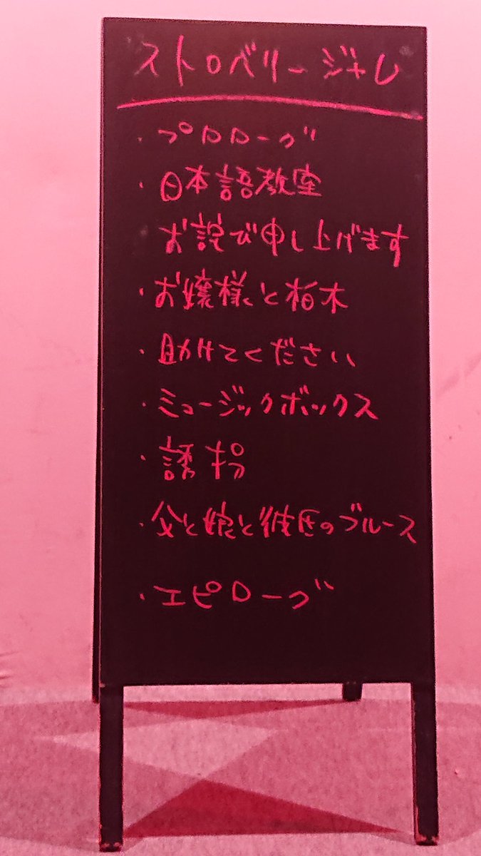 ストロベリージャム。自分の観た回は、らうちゃんがぶりっ子アイドルとしてラジオ番組に招かれると言う設定なんだけど、生歌何曲か聞けて最高でしたね、らうちゃんがやるなら、初めの曲にダンス入ったもっとアイドルっぽい曲入ってても面白いとおもうな
