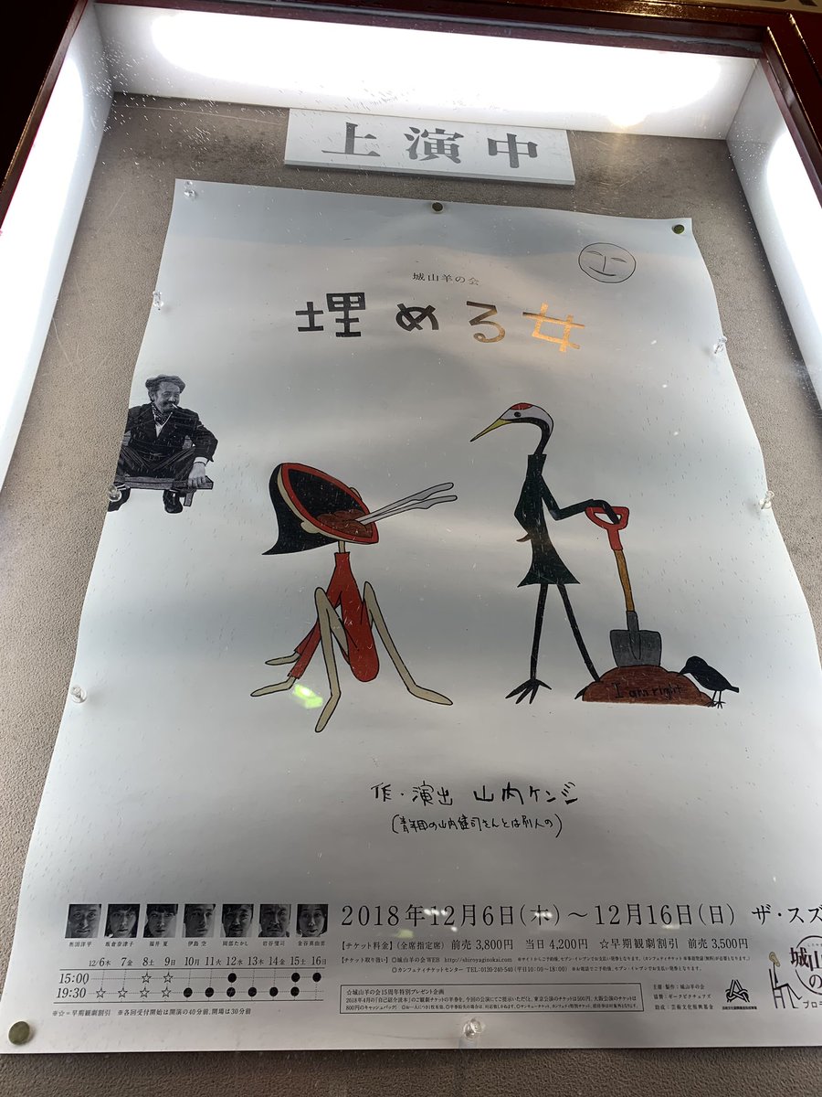 今日の観劇☆ 城山羊の会『埋める女』@スズナリ 遅まきながら、今年から観劇💦 もちろん内容は言えませんが、 あの超満員の会場は、圧が凄い💦 一言一言、客席側は耳に全神経傾ける。どっと笑い。 あの中で芝居するの楽しそうだなぁ~。 https://t.co/60EjYTcJMW