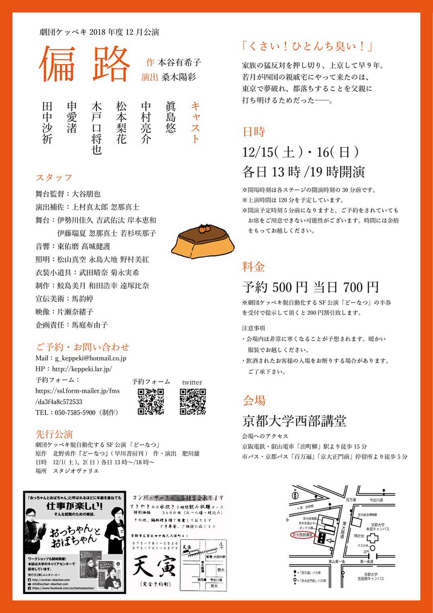 【今週の公演情報】2018/12/15土-2018/12/16日[京都府/吉田本町]京都大学西部講堂▽劇団ケッペキ 2018年度12月公演「偏路」▽ 約120分▽https://t.co/QUMyIqxuFC #上演時間