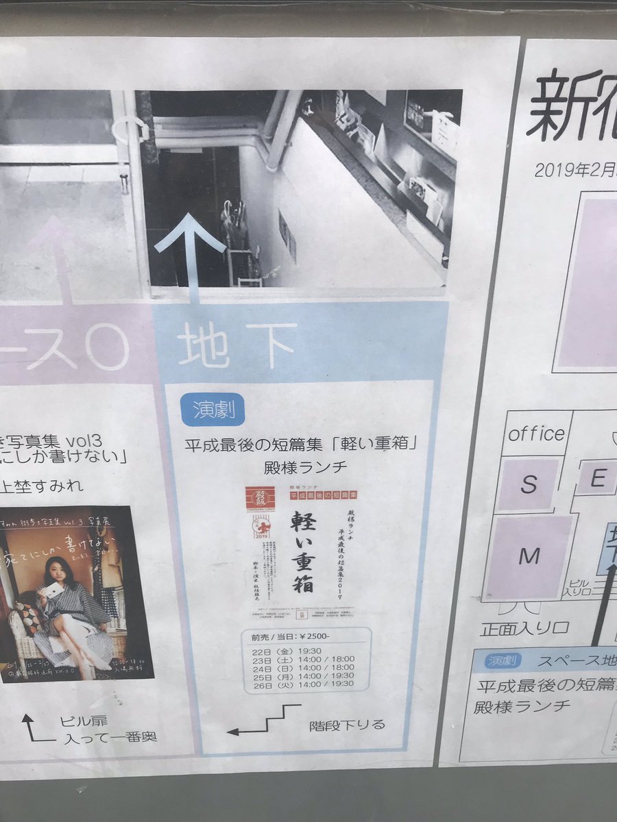 本日の現場 新宿にて殿様ランチの公演「軽い重箱」を観てきました! 数年ぶりに観る殿様ランチ、90分があっという間でめっちゃ面白かった♪ 場所: 新宿眼科画廊 スペース地下 https://t.co/HAYJmz8GAo