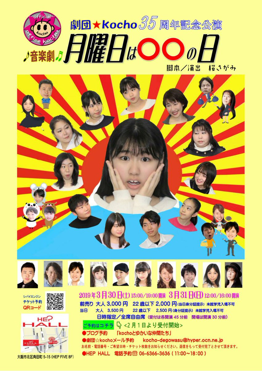 27. 劇団★kocho35周年記念公演 「音楽劇 月曜日は○○の日」 2019年3月30日(土) 15:00/19:00 31日(日) 12:00/16:00 HEP HALL 大阪市北区角田町5… https://t.co/sYTxSp25Xn