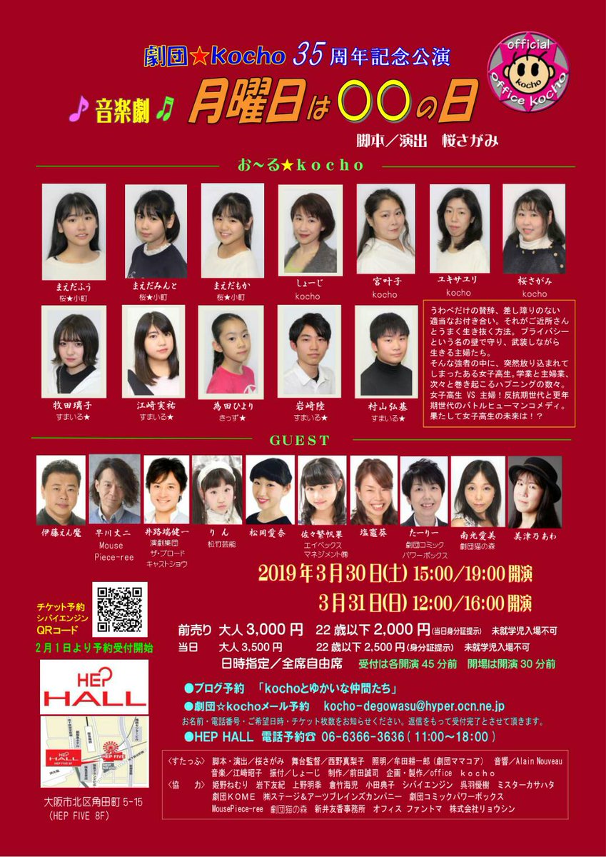 25. 劇団★kocho35周年記念 「音楽劇 月曜日は○○の日」 脚本・演出 桜さがみ 3月30日(土) 15:00/19:00 @ HEPHALL 初日ーー‼️‼15:00~は有難い事に満席です‼‼️19:00~はまだお席御用意出来ま… https://t.co/C3ZJ4sj304