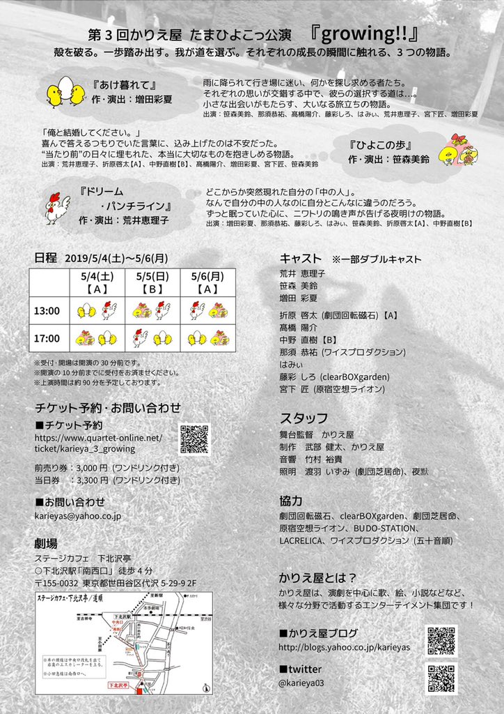16. 5/4(土)〜6日(月) かりえ屋( @karieya03 )さん たまひよこっ公演 『growing!!』 @ステージカフェ下北沢亭 明日からお手伝いさせていただきます! 前売 ¥3,000 / 当日 ¥3,300 (1ドリン… https://t.co/rqW3VtpTu1