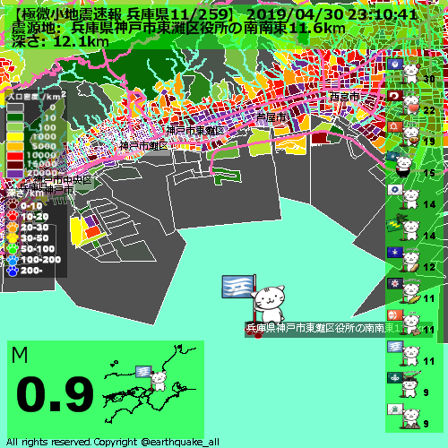 【極微小地震速報 兵庫県11/259】 2019/04/30 23:10:41 JST, 兵庫県神戸市東灘区役所の南南東11.6km, M0.9, TNT337.6g, 深さ12.1km, 1292 https://t.co/5rS7qoyBFp