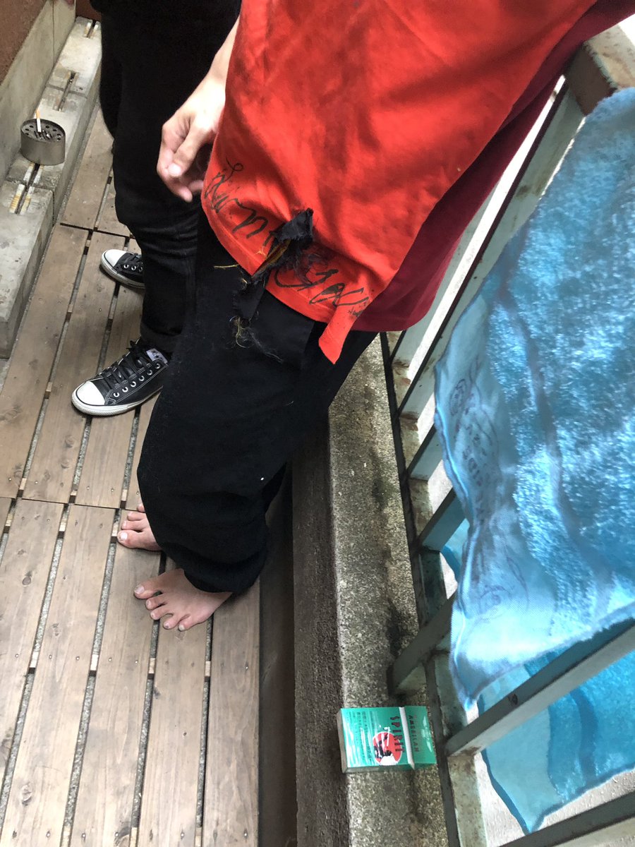 サマースプリングの上演は明日月曜日まで。気になる方は是非! (写真は、舞台ソデ的なベランダで終演後一息つく貴一くんの脚と、ベランダから下を見下ろした光景。舞台自体はビル5階にある密室です) https://t.co/v8ELXQ4czn