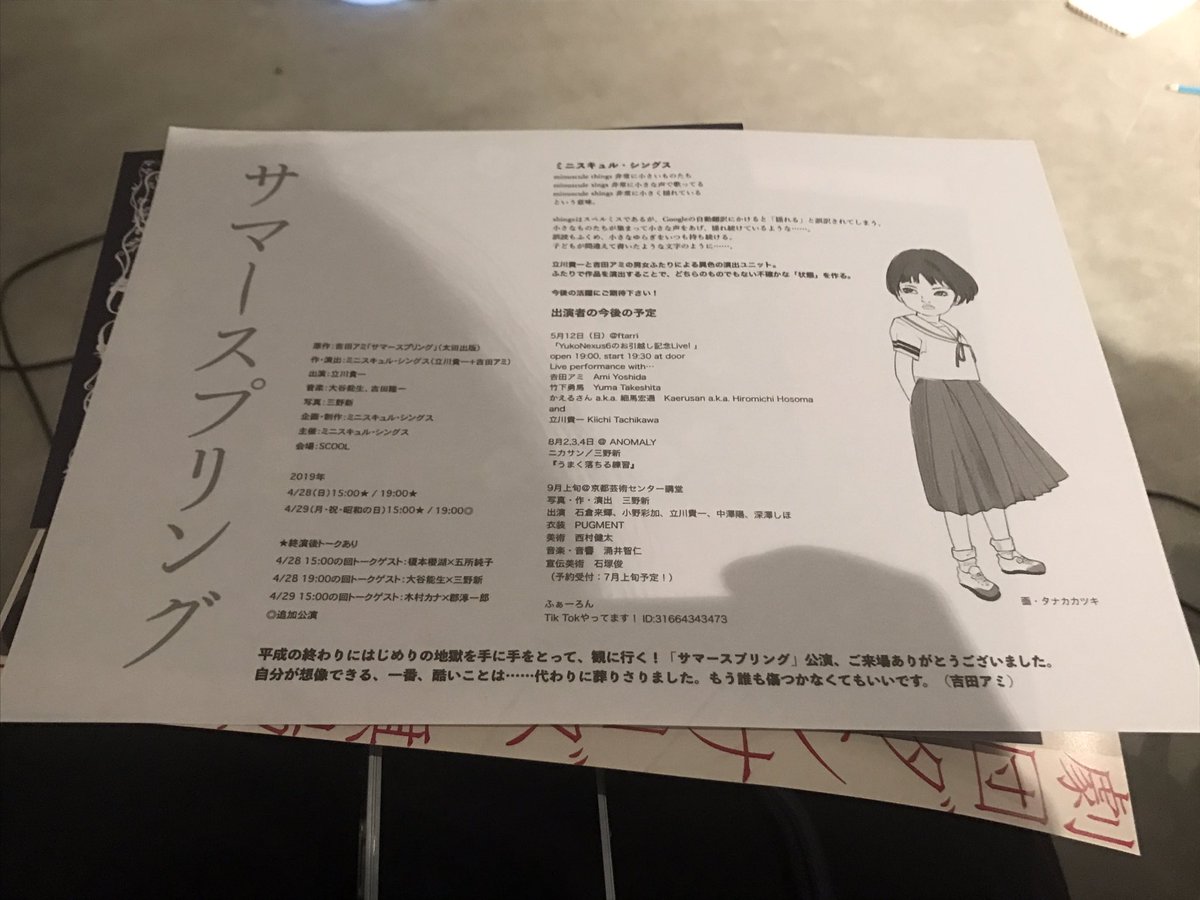ミニスキュル・シングス『サマースプリング』は、本日最終日でした。構造をどう形式化して整理させた上で、身体をまざまざと見せ、発話させるか、という演劇の様式を知らずに踏み外すことによって、演劇ってなにか、という部分が逆照射されるように思えた。
