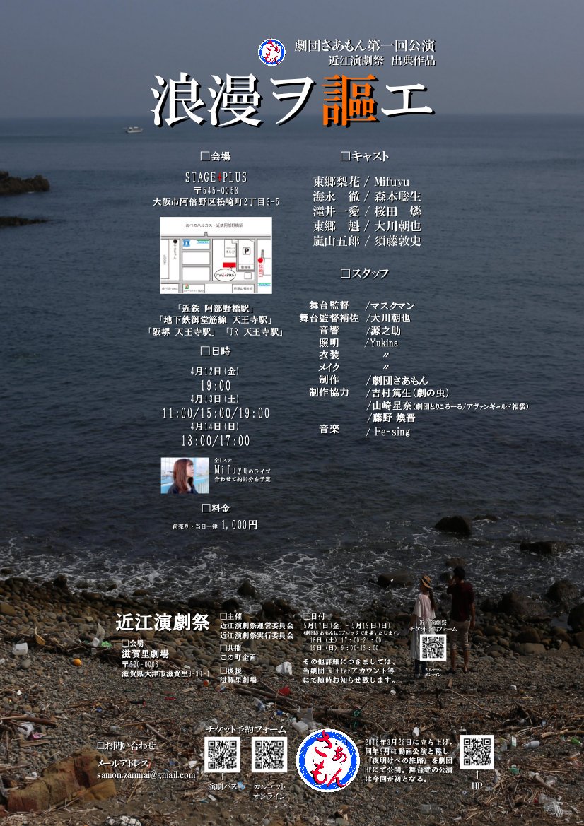 【挟み込み情報】 劇団さあもん第一回公演 『 《日時》 4月12日 12:00 《場所》 STAGE+PLUS 《部数》 180部 挟み込み作業はこちらで致します。 ※挟み込み希望の方はDMにて事前にご連絡下さい。 #浪漫ヲ謳エ