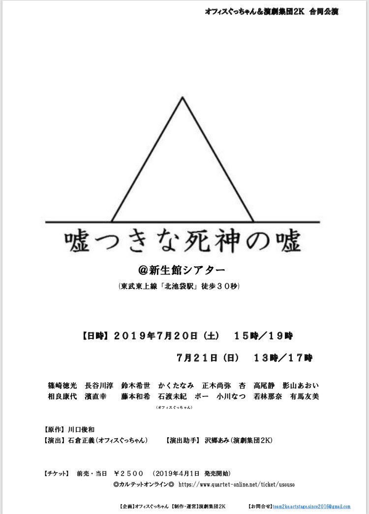 ■出演告知 オフィスぐっちゃん&演劇集団2K 合同公演 『嘘つきな死神の嘘』 【日時】 2019年 7月21日(日) 13時/17時 ■料金 前売・当日 2500円 【会場】 北池袋 新生館シアター… https://t.co/jU9O54qW55