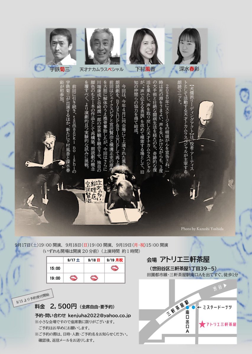 ◉犬儒派リーディングアクト◉ 朗読公演 『この世界では、ラジオは肉で出来ている』 9/17(土)~9/19(月祝) 於:アトリエ三軒茶屋 ◎原作 W.シェイクスピア/宮沢賢治/横溝正史/川端康成/谷崎潤一郎 ◎出演 宇鉄菊三/天… https://t.co/8UaufLMu7a