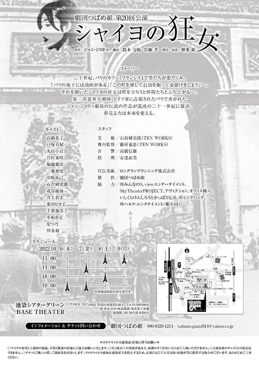 劇団つばめ組 第20回公演 『シャイヨの狂女』 2022年10月6日㈭19:00 7日㈮14:00 19:00 8日㈯13:00 18:00 9日㈰13:00 ※開場は開演の40分前 〈チケット〉 前売4,000円 当日… https://t.co/klcBsX4tgT