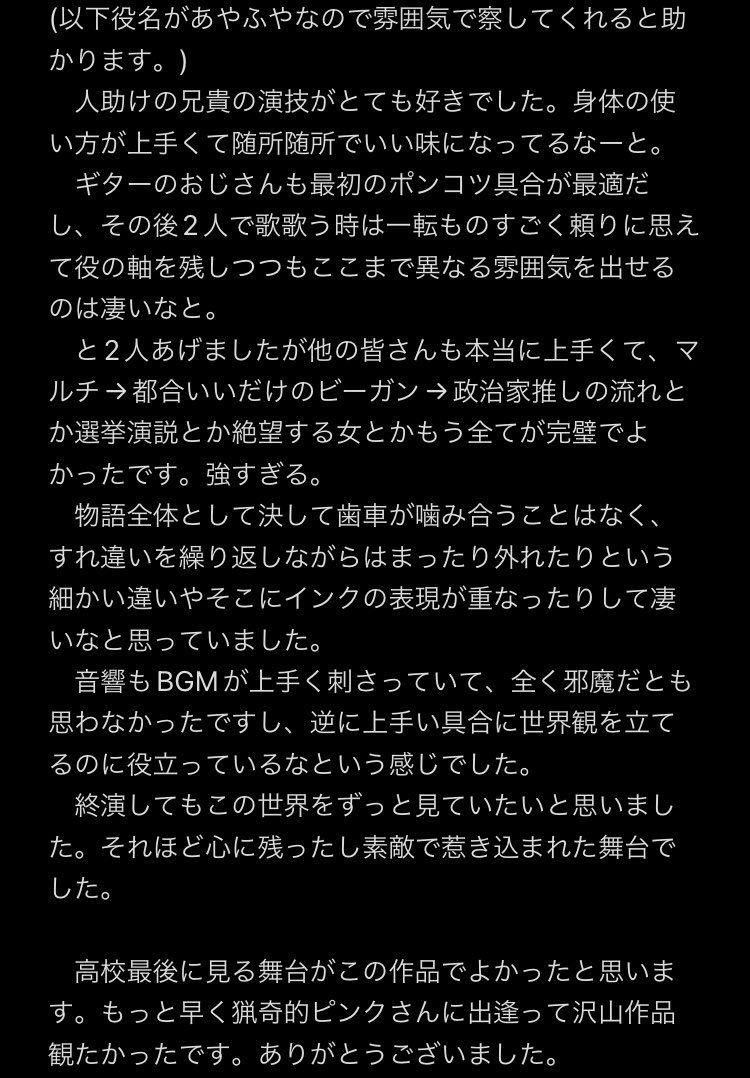 14. まさにリアルなお話で演劇を観てる感じがしなかったです。 ダイレクトに色々な言葉や情景が胸に突き刺さって終わった頃には無になっていました😶 本当にすごかった… https://t.co/zCl7xBfai3 #猟奇的ピンク #サイレントシティポップ