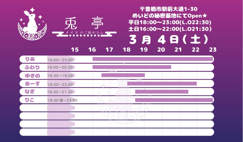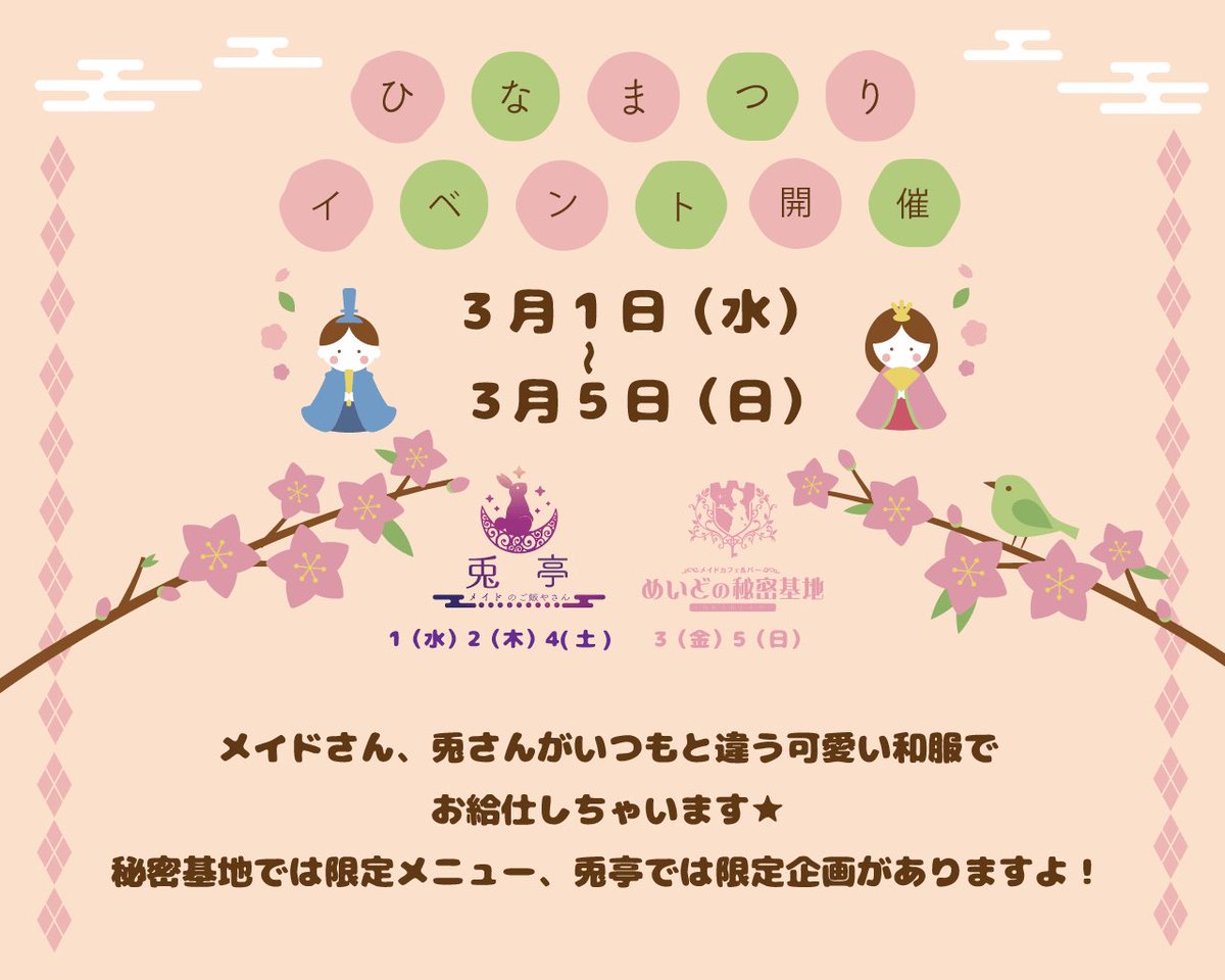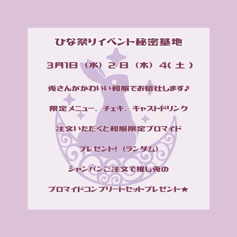 兎亭オープンしました🌙 ひな祭りイベント、兎亭は最終日になります🌸✴🎎✴🌸 22時までご帰宅お待ちしております🐰 https://t.co/EkORdTTdMn #コンカフェ #メイド #浜松 #豊橋