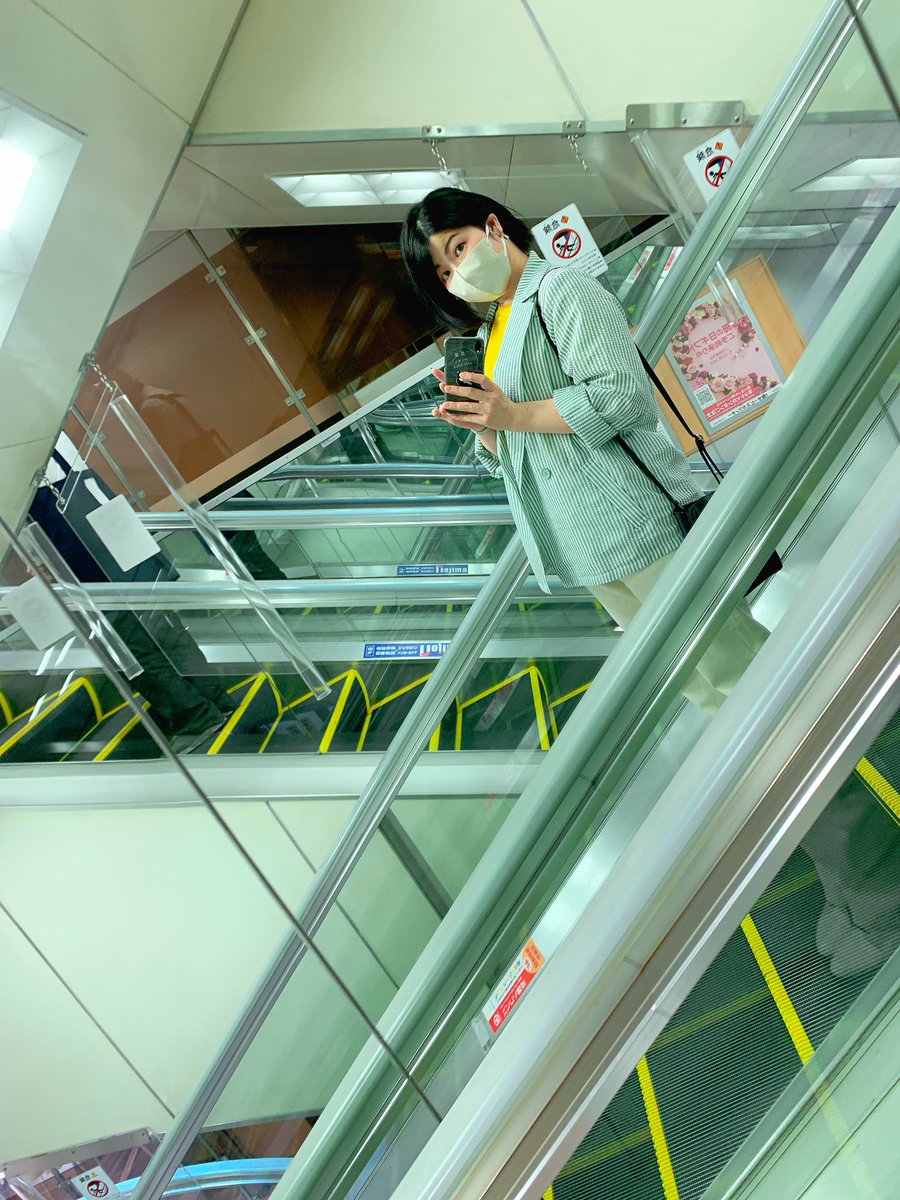 おやつの鳩時計さんの 『プレーグラウンド』観てきた!! 明日もあるからみんなも行って〜 45分間のSF可愛い楽しいだった🥳 チラシと同じ色みで服着てきちゃった…と後から気づいて恥ずかしい人。 エスカレーター脚長に撮れるな。 https://t.co/ogFGdBeuN7