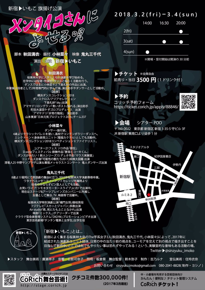 | 説明 | 「新宿いもこ」とは...新宿によく集まる桜美林大卒のThe芋系女子3人(秋田満衣、鬼丸三千代、小林菜々)によって、2017年に結成された演劇系ユニット団体。 日常の中の当たり前の視点を、ユーモアを交えて別の視点で描き出すことを目指して創作中。ここでは何でもやりたい事は恐れずやってみる!という、実験室的な意味もある活動の場。 |