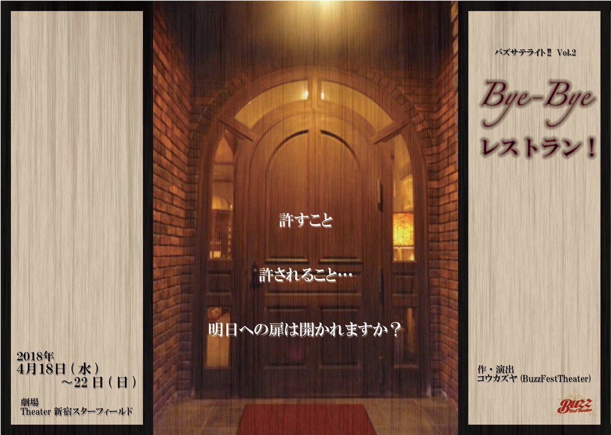 今日はバズサテライト公演「Bye-Byeレストラン!」を観劇。やはり僕はコウさんの作品が好きだ。 だから沢山の方に観て欲しいし、知って欲しい。 6月にはBuzzFestTheaterの本公演が、東京と大阪である。 更に知れ渡るな(… https://t.co/OUlLAlL9fU