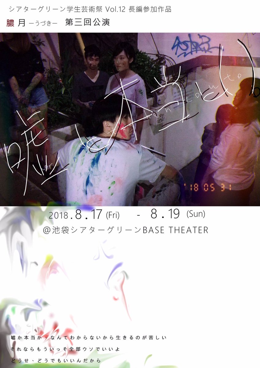🙌お知らせ🙌 膿月-うづき- 第三回公演「嘘と本当と( )。」 8月17日(金)〜8月19日(日) 17,18日 13:00〜/18:00〜 19日 13:00〜 全5stやります! 池袋にあるシアターグリーンBase thea… https://t.co/wxK54IxDln