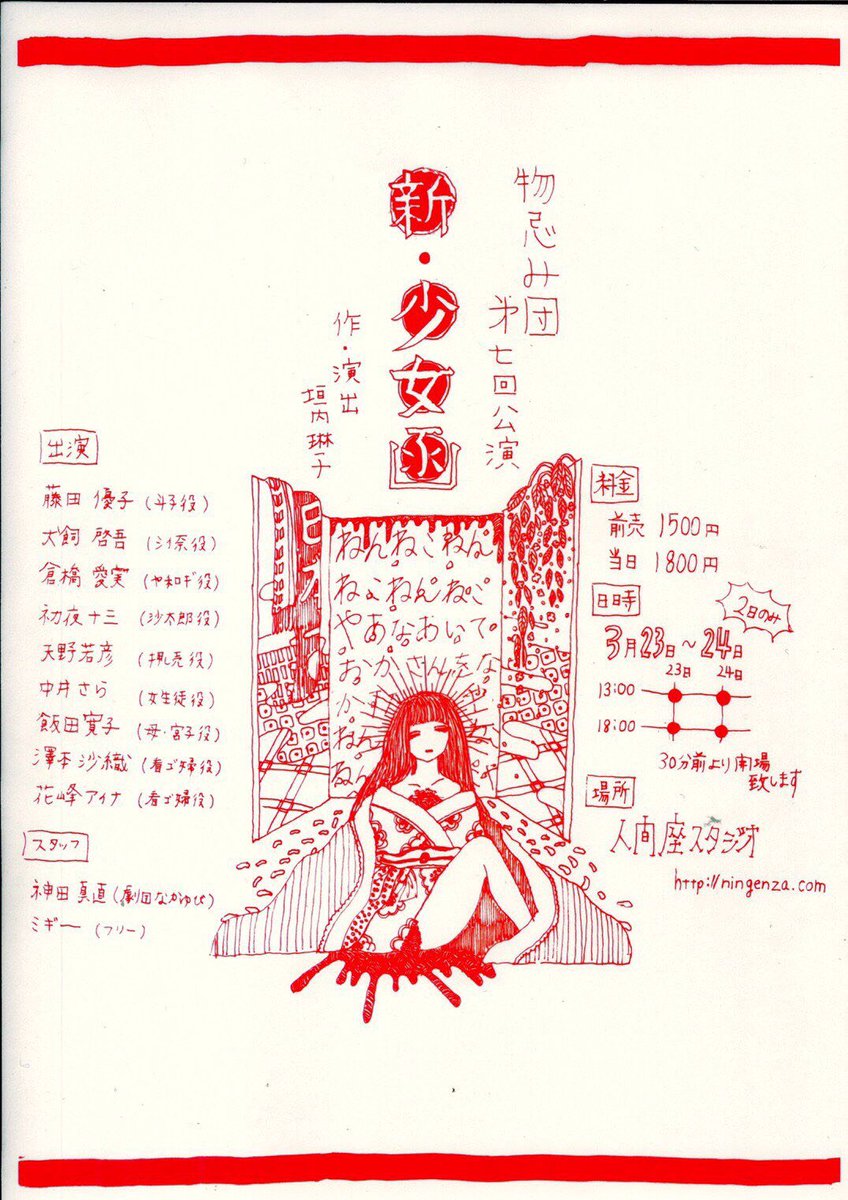今週、どうですか? 物忌み団第七回公演 『新・少女函』 脚本・演出:垣内琳子 3/23(土)13:00-/18:00- 3/24(日)13:00-/18:00- ☆開場は開演の30分前 人間座スタジオ 【前売】 1500円… https://t.co/4FRjuqinFH