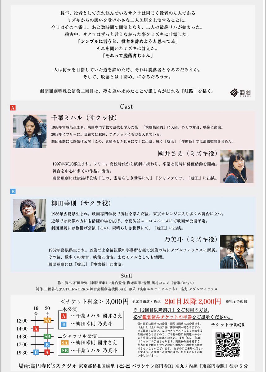 劇団亜劇特殊公演第二回「幸福な脱落者」全公演終幕しました。ご来場頂いた皆様には心より感謝致します。 今回もまた、自分の弱さを知りました。これでまた面白いものが作れる。 また、旅に出られる。また次回お会いしましょう!
