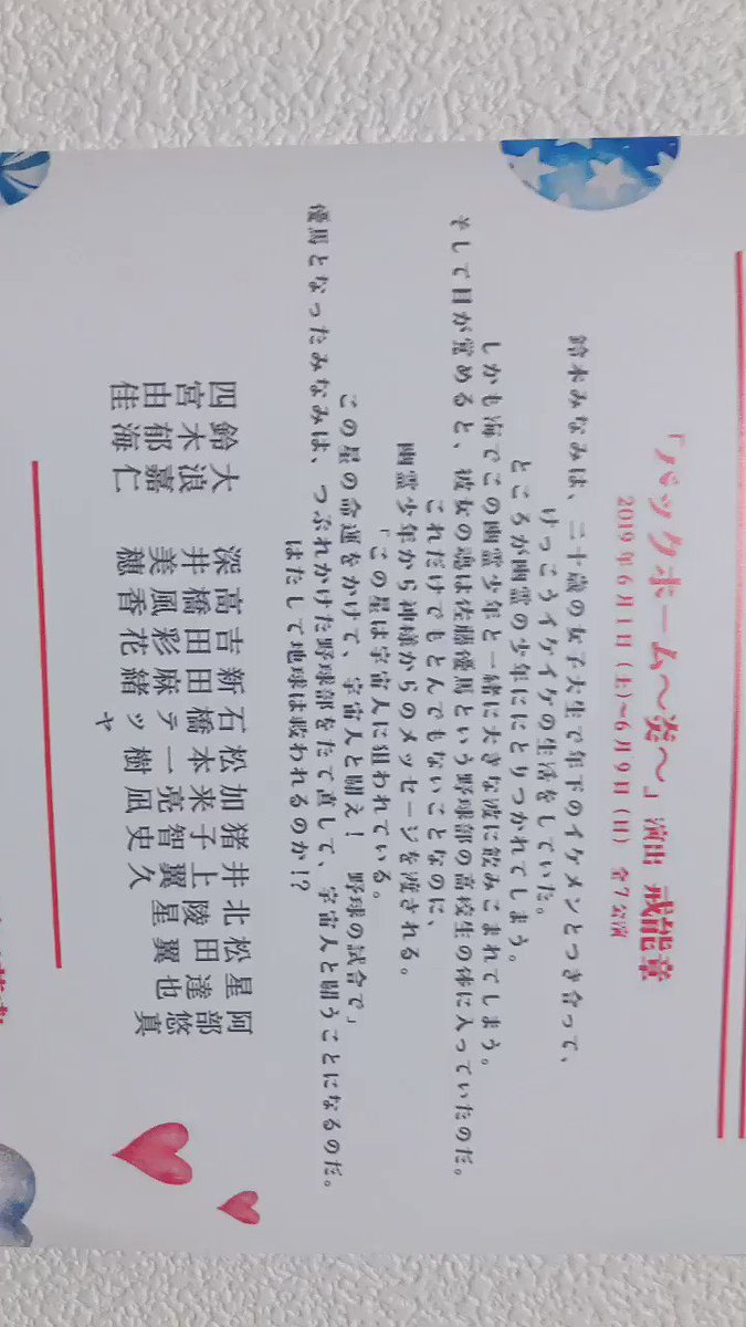 | 説明 | ミュージカル『バックホーム』 ~イントロダクション~ 廃部寸前の女子ソフトボール部。 なぜか彼女たちが、地球の命運をかけて宇宙人チームと試合することになってしまう。 負けたら地球は宇宙人のものとなってしまう!勝てるの?こんなあたしたちに。 舞台『バックホーム~炎~』 ~イントロダクション~ 鈴木みなみは、二十歳の女子大生で年下のイケメンとつき合って、けっこうイケイケの生活をしていた。 ところが幽霊の少年ににとりつかれてしまう。 しかも海でこの幽霊少年と一緒に大きな波に飲みこまれてしまう。 そして目が覚めると、彼女の魂は佐藤優馬という野球部の高校生の体に入っていたのだ。 これだけでもとんでもないことなのに、幽霊少年から神様からのメッセージを渡される。「この星は宇宙人に狙われている。この星の命運をかけて、宇宙人と闘え! 野球の試合で」 優馬となったみなみは、つぶれかけた野球部をたて直して、宇宙人と闘うことになるのだ。 はたして地球は救われるのか!? 舞台【 グッドノート 】 ~イントロダクション~ 『デバイジング』という用語があります。 分けるという意味なのですが、演劇の稽古場では出演者たちが稽古場で起きたことを共有していきながら、一つの作品を作り上げていくときに、この言葉を使います。 「今回はデバイジングで創りあげた作品を上演致します。 インプロ『OvObライブ』 完全即興のエンターテイメントショー!! 荻窪にて新感覚エンターテイメント開幕!! |