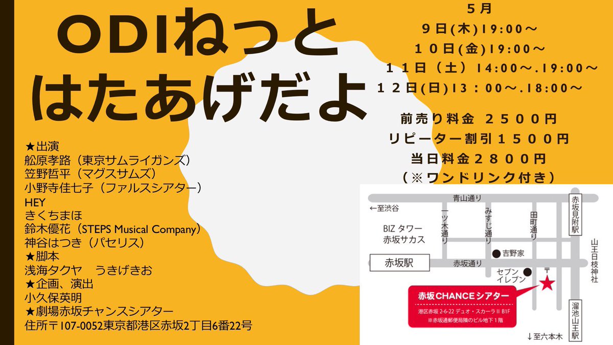 本日、 ODIねっと旗揚げ公演「はたあげだよ」 初日!つまり旗揚げのほんと旗揚げ!!(?) 19時から赤坂チャンスシアターにて。 当日券あります。 ぜひふらっと遊びに来てください! https://t.co/Qq15OJG6n4