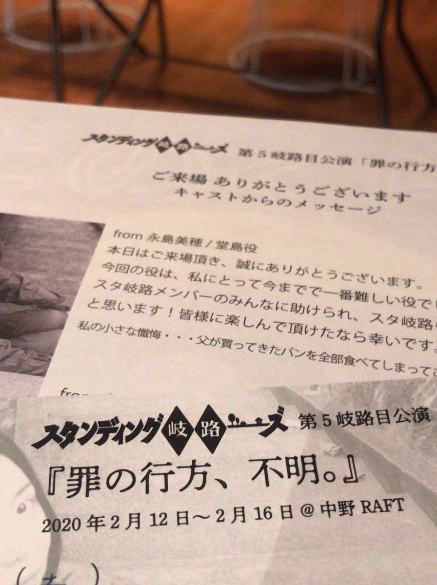 舞台 スタンディング岐路ーズ第5岐路目公演 「罪の行方、不明。」 全10回公演、本日全て無事に終えることができました!! 本公演に携わった全ての方、そしてご来場いただきました全てのお客様に心から感謝申し上げます。 本当にあり… https://t.co/ptWJz7f7OZ