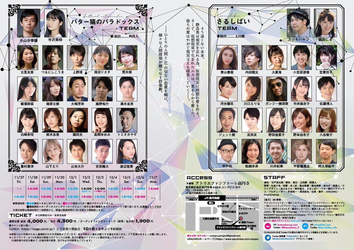 | スタッフ | 照明:矢島千浩/音響:井上匠/舞台監督・舞台美術:林大介、新直人/制作協力:さるしばい、バター猫のパラドックス/プロデューサー:手島昭一、浅沼直也/企画・制作:URAZARU、AltanCinemas |