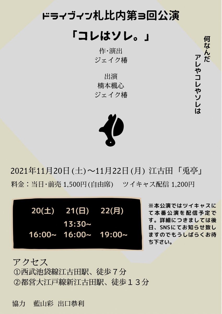 / 📌 第3回公演 『コレはソレ。』千秋楽🐢 2021年11月20日(土)〜22日(月) 江古田「兎亭」 \ 👉11月22日(月)19:00 ※受付開始・開場は、開演の20分前です。 ※上演時間は45分で… https://t.co/KNHMCL5Gbt #ドライブイン札比内