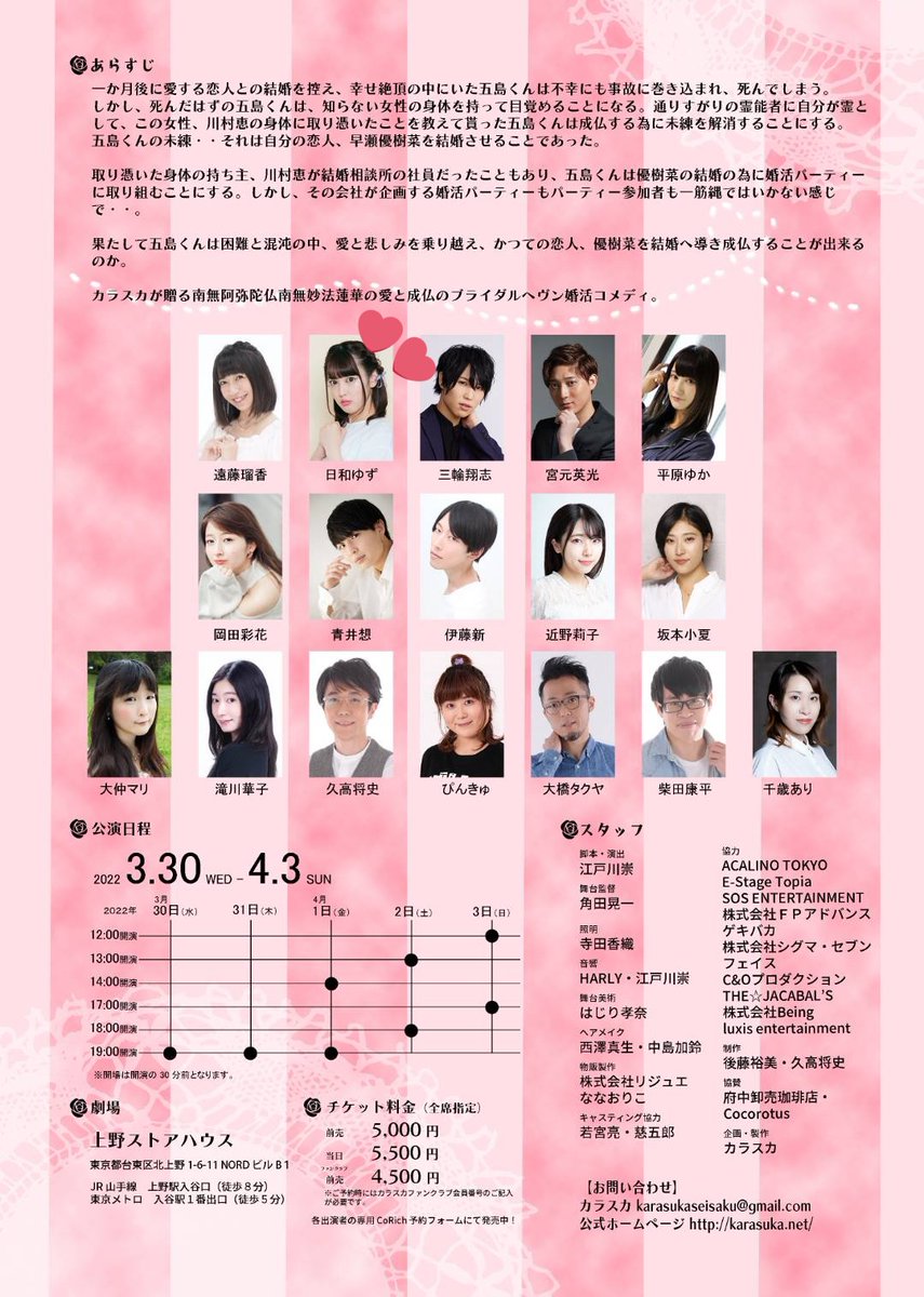 4日目! !! 13:00 / 18:00 開演!!! 遠藤瑠香様 主演 舞台「五島くんの花嫁」 2022.3.30-4.3 上野ストアハウス 当日券は公式の情報をご確認ください。 →カラスカ公式様(… https://t.co/VsUj1Fxjdh