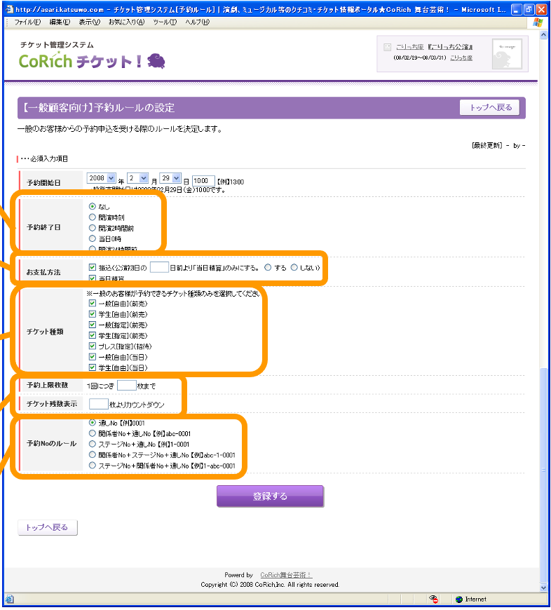 チケットの予約限度数と、チケット予約ページに表示されるチケット残数の設定をします。 - ■予約Noルール