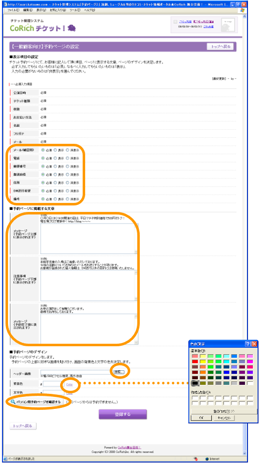 チケット予約画面に表示させるメッセージを入力します。 - ■予約ページのデザイン