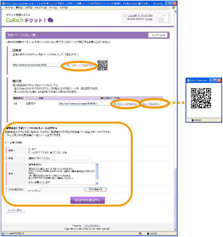 〔予約ページを確認する〕ボタンをクリックすると団体用の予約ページが別ウィンドウで表示されます。 - ■個人用: