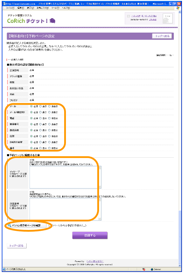 チケット予約画面に表示させるメッセージを入力します。 - ■予約ページに掲載する文章