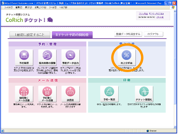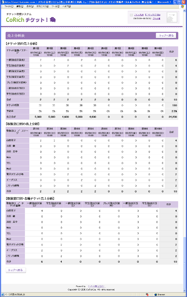 「チケット別売上分析」、「取扱窓口別の売上分析」、「取扱窓口別・各種チケット売上分析」のデータが表示されます。
