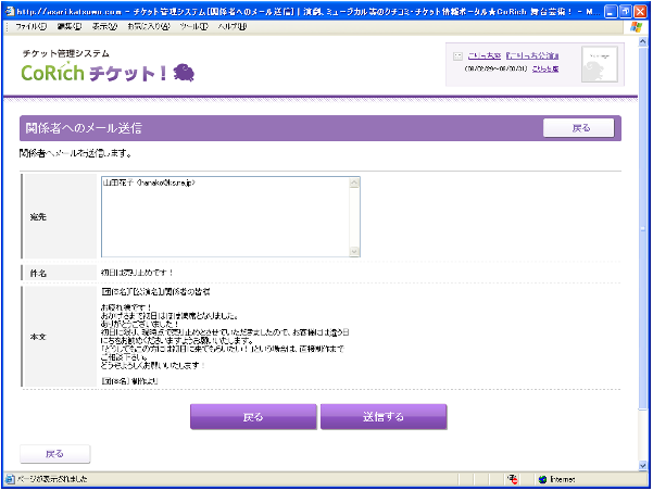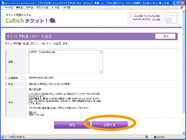 ③【チケット予約者へのメール送信確認】画面が表示されます。