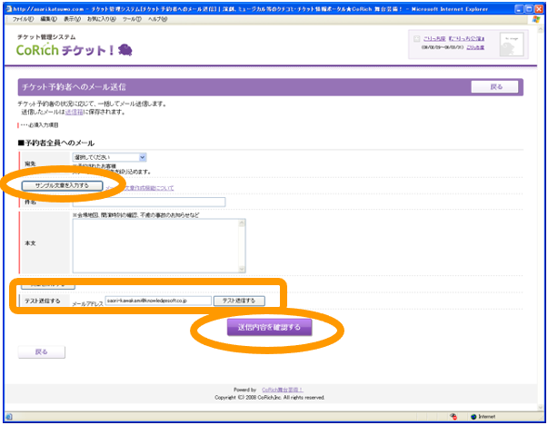 メール内容を入力して〔送信内容を確認する〕ボタンをクリックします。